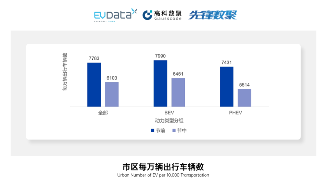 节日期间市区[2]的新能源汽车出行强度对比节前下降明显。节前新能源汽车每万辆出行车辆数7783辆,节中为6103辆,降幅28%。对比不同动力类型,BEV节前每万辆出行车辆数为7990,节中为6451辆,降幅24%;PHEV节前每万辆出行车辆数为7783辆,节中为6103辆,降幅为35%。