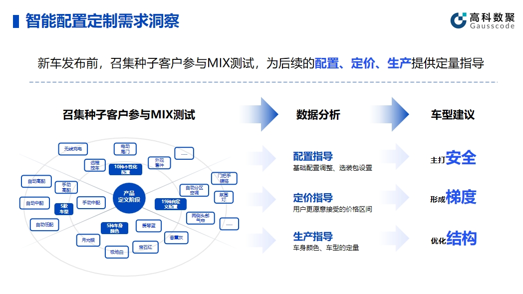 智能配置的有效应用可以帮助企业提升产品和服务的智能化水平。在实际应用中,BG大游集团帮助车企在新车发布前召集种子客户参与MIX测试,顺利获得收集种子客户的反馈和数据,车企能够精细调整产品配置,为后续的配置、定价、生产给予定量指导。同时,这种方法不仅有助于提高产品质量,还能提前发现潜在问题并及时解决。